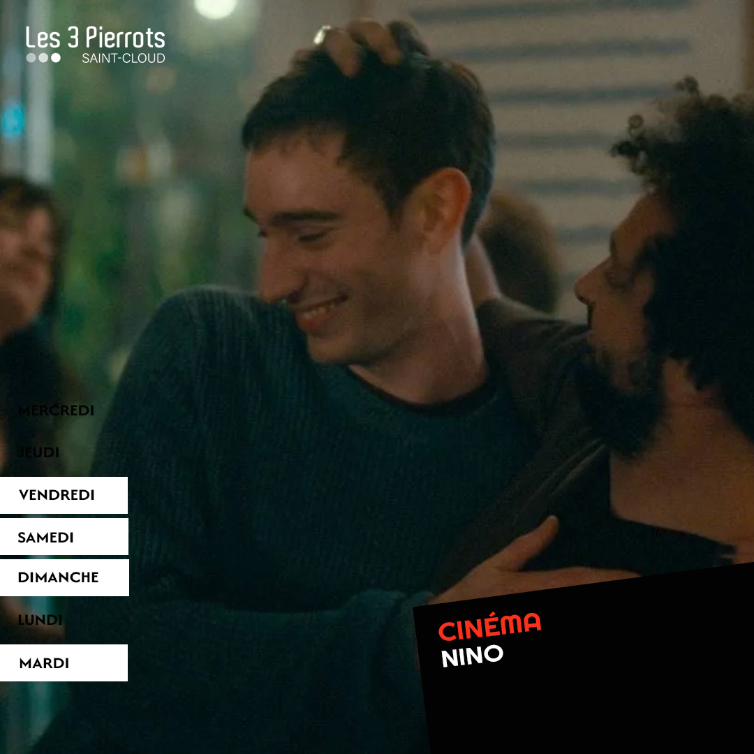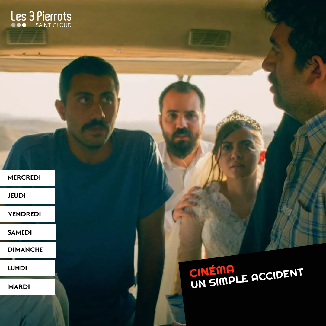 01 oct 07 oct Du Mercredi 1 octobre 2025 au Mardi 7 octobre 2025 Culture Les 3 Pierrots UN SIMPLE ACCIDENT voPalme d’Or - Festival de CannesFrance, Luxembourg, Iran – 1h42 - DrameRéalisé par Jafar PanahiIran, un homme croise par hasard celui qu’il croit être son ancien tortionnaire.Mer : 20h30 | Jeu : 21h | Ven : 16h, 20h30Sam : 16h, 20h30 | Dim : 14h, 16h15, 20h45Lun : 16h15, 20h30 | Mar : 20h30CLASSE MOYENNEFrance, Belgique – 1h35 - ComédieRéalisé par Antony CordierMehdi a prévu de passer un été tranquille chez ses beaux-parents, mais tout s’envenime...Mer : 16h | Ven : 18h15, 20h45 | Sam : 14h, 20h45Dim : 14h15, 18h30 | Lun : 14h, 16h | Mar : 14h15 L’INTÉRÊT D’ADAMFilm d’ouverture – Semaine de la CritiqueBelgique, France - 1h18 - DrameRéalisé par Laura WandelFace à la détresse d’une jeune mère, une infirmière met tout en œuvre pour l’aider.Ven : 16h15 | Sam : 18h15 | Dim : 16h30, 20h30Lun : 14h15 | Dim : 16h, 20h45 NINOPrix - Semaine de la CritiqueFrance - 1h36 - DrameRéalisé par Pauline LoquèsDans trois jours, Nino devra affronter une grande épreuve.Ven : 18h | Sam : 14h15, 18h | Dim : 11h15, 18h15Mar : 14h, 16h30 CHAMBOULTOUT Dans le cadre de la JOURNÉE DES AIDANTSFrance - 1h40 - Comédie, DrameRéalisé par Éric LavaineBéatrice célèbre la sortie de son livre, dans lequel elle raconte l’accident de son mari qui a bouleversé leur vie.Lun : 20h** Séance en sme : sous-titres sourds et malentendants TIMIOCHEÀ partir de 3 ans, vfGrande-Bretagne, Russie, Allemagne41 min - Animation, FamilleRéalisé par Alex Bain, Andy MartinLe petit poisson qui racontait des histoires…Mer : 14h | Sam : 16h15 | Dim : 11h30 Tout l'agenda