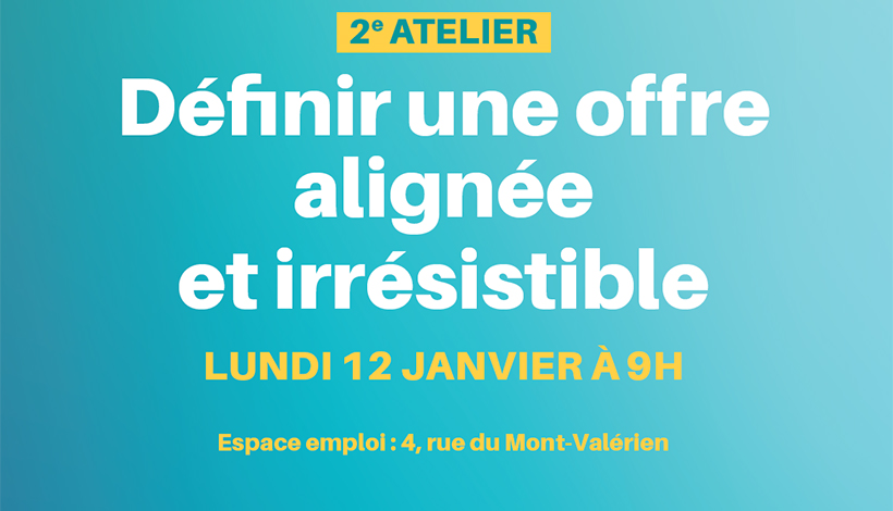 Dans le cadre du cycle Se démarquer, révéler et accélérer son identité entrepreneuriale, Saint-Cloud Entreprises vous invite à participer au second atelier Définir une offre alignée et irrésistible le 12 janvier de 9h à 12h, à l'Espace emploi.