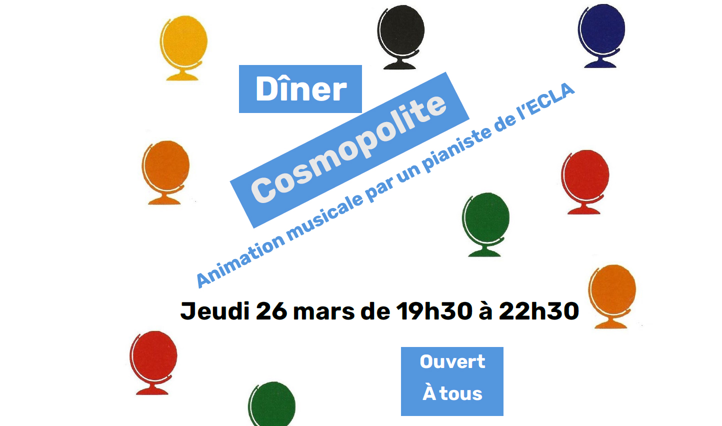 Le jeudi 26 mars de 19h30 à 22h30, venez partager vos spécialités lors du dîner cosmopolite organisé par l’AVF, avec la participation de l’ECLA et du CFAE, autour d’une animation musicale.