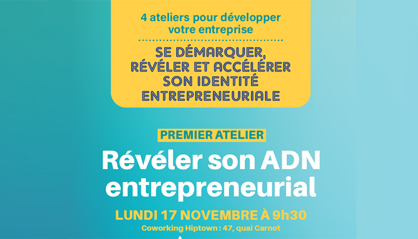 Rendez-vous pour le premier atelier Révéler son ADN entrepreneurial le 17 novembre à 9h30 au Coworking Hiptown, 47, quai Carnot.