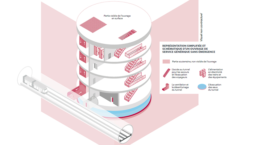 En plus des gares et des tunnels, le Grand Paris Express nécessite la construction d’un ensemble d’ouvrages plus modestes et moins visibles : les ouvrages de service. Ils sont indispensables au bon fonctionnement du métro souterrain, au confort et à la sécurité des voyageurs. Pouvant assurer plusieurs fonctions, ils garantiront la bonne circulation de l’air dans les tunnels et une température confortable sur l’ensemble du réseau. Ils servent aussi d’accès de secours pour permettre aux pompiers d’intervenir rapidement en cas d’incident. Ces puits d’accès sont édifiés à intervalles réguliers de 800 mètres maximum.