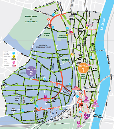 Saint-Cloud dispose de places de stationnement en zone rotative (marquage rouge sur la voirie) et en zone résident (marquage blanc sur la voirie).